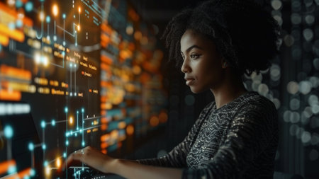 Young Professional woman Engaging with Computer Technology in Modern Workspace. innovative technology concept in blue ambient light