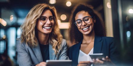 Two businesswomen collaborating at a modern workspace, exchanging ideas and technology during a productive afternoon meeting