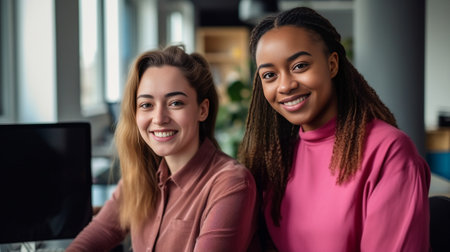 Blissful asian programmer embracing female blonde colleague for photo and smiling Indoor portrait of glad african office worker posing beside european friend at her workp : Generative AI
