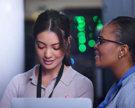 Whats the prognoses. two attractive young female computer programmers working together in a server room.