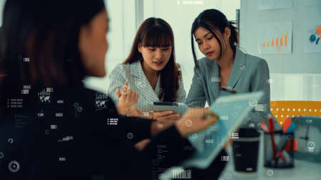 Business people in corporate staff meeting with envisional graphic . Concept of digital technology for marketing data analysis and investment decision making .