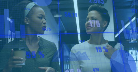 Image of data processing and diagrams over diverse female colleagues discussing work in office. Global business and digital interface concept digitally generated image.