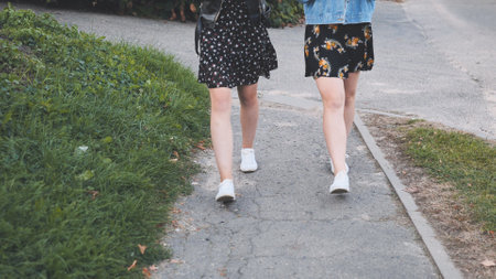 view from the top of the legs of the two girls in sneakers