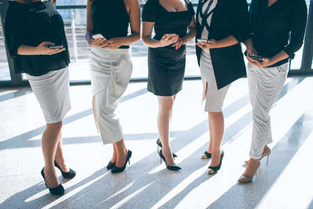 Group of five formal businesswomen sitting on a bench against a wall outside in the city. Legs of businesspeople sitting outdoors on a chair together