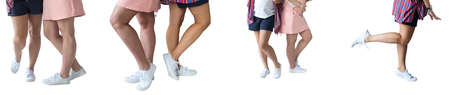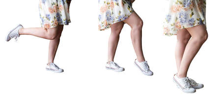 Beautiful slender female legs on a white in sneakers.