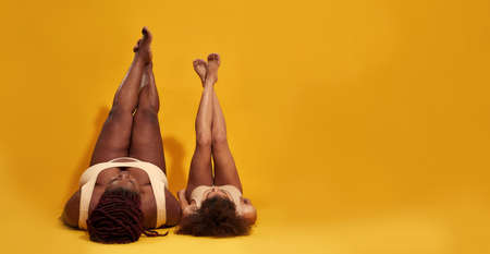 Two young african american women in underwear lying down on the floor with their legs up isolated over yellow background