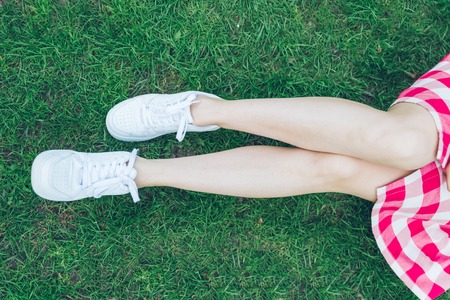 woman legs in white shoes green grass on background