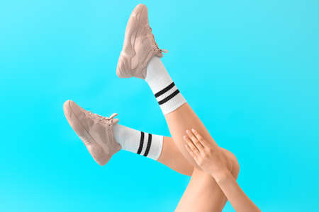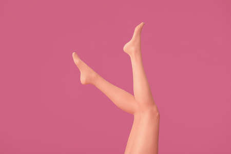 Legs of beautiful young woman on color background