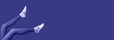 Horizontal veri peri banner with women legs in violet tights.