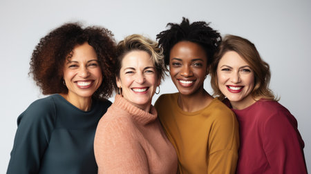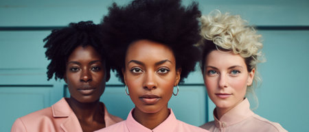 Portrait of multi-racial women standing together, their expressions confident and proud, celebrating sisterhood.