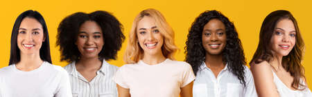 Five Diverse Women In Group Portrait Over Yellow Background. Smiling Females Headshots Of Successful Happy Millennial Ladies Posing Together. Diverse Female Beauty Collage. Composite Image, Panorama