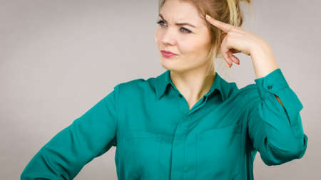 Business woman in blue shirt emotions posing light background