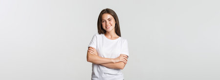 Portrait of confident attractive woman, cross arms chest and smiling pleased