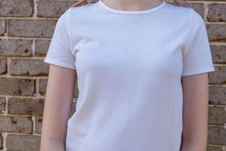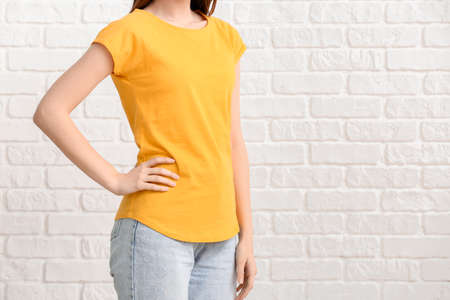 Girl wearing mockup white t-shirt on brick wall background. Template copy space fashion