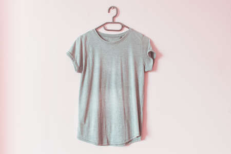 Old not ironed folded casual t shirt clothes mockup hanging on the wall on a rack.