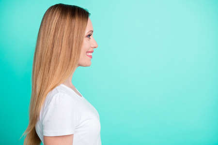 Profile side photo of nice lady looking smiling wearing white t-shirt isolated over teal turquoise background