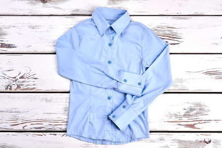 Light blue shirt with long sleeves. Formal shirt on wooden background. Beautiful buttoned blue shirt on sale.