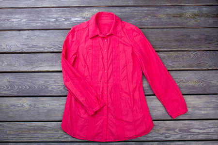 Top view pink blouse. Wooden desk surface background.