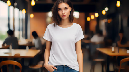 Portrait of a beautiful young woman in a white T-shirt in a cafe.