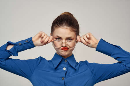 Portrait of emotional woman in blue shirt and glasses bright makeup model light background cropped view Copy Space