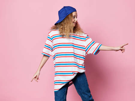 girl in fashionable clothes in a blue cap pink background modern style