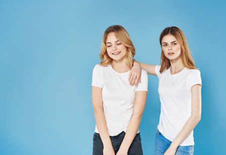 Two girlfriends in white t-shirts tired look vacation lifestyle pink background