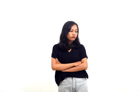 Portrait of unsatisfied asian woman standing with arms folded isolated over white background