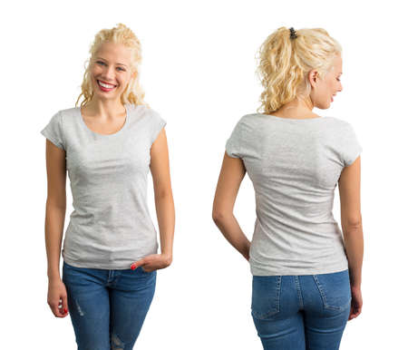 Young woman dressed in blank white t-shirt and blue jeans posing against the wall. Front and back view. Grey background. Mockup for design print or t-shirt print store