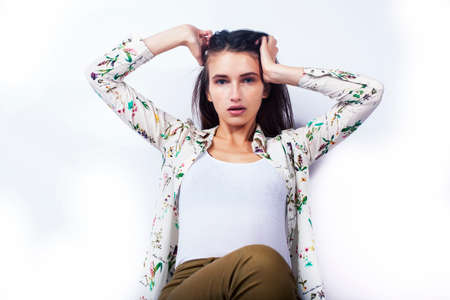 young pretty brunette girl hipster posing frendly against white background wall, smiling woman with long hair