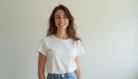 Woman wearing white blank t-shirt with space for your logo, mock up for design indoors.