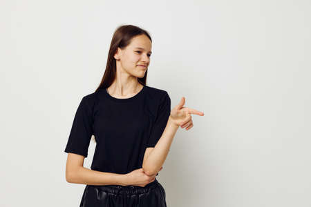 Attractive young woman showing and pointing to the design print of a mock-up t-shirt. Smiling woman in a black template t-shirt
