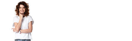 panoramic concept of happy and curly woman standing isolated on white
