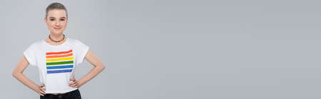 smiling woman in necklace and lgbt colors t-shirt posing with hands on hips isolated on grey, banner