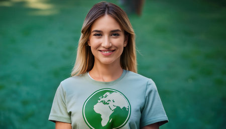 Smiling individual advocates for sustainability wearing a green Earth logo shirt outdoors