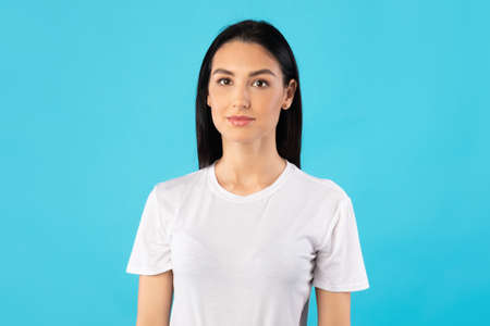 Pretty serious woman in white mockup t-shirt stands in studio on a gray background