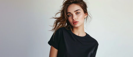 Stylish Woman Showcasing A Black Tshirt And Jeans On A Clean Backdrop. Сoncept Minimalist Fashion, Chic Monochrome Outfit, Clean And Sleek Look.