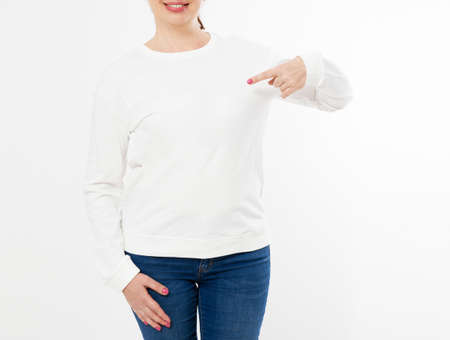 White long sleeve t-shirt on a middle aged woman in jeans and pointed hand isolated, front , mockup
