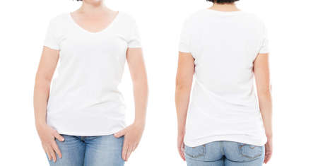 front and rear views woman, girl in t-shirt isolated on white background, set t shirt