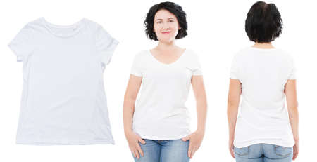 T-shirt design and people concept - close up of middle aged woman in blank white t-shirt, shirt, front and rear isolated.