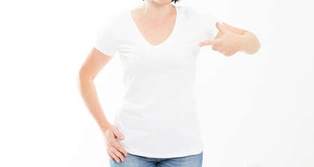 Woman In White T-shirt Pointing To Herself. Point tshirt mock up copy space - cropped image.