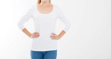 young caucasian, europian woman, girl in blank white t-shirt. t shirt design and people concept. Shirts front view isolated on white background. Mock up. Copy space.