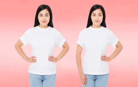 Front and back views of young asian japanese girl woman in stylish t-shirt on white background. Mock up design. copyspace. template. Blank