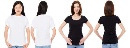 asian and caucasian woman in blank white and black t-shirt : front and back views, mock up, design template