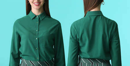 Beautiful young businesswoman in stylish shirt on color background. Front and back view