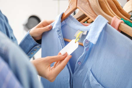 Female hands and blank paper label on clothes