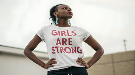 Confident woman standing with hands on hips wearing white T-shirt with bold red text 'GIRLS ARE STRONG' outdoors. Feminist activism and empowerment concept