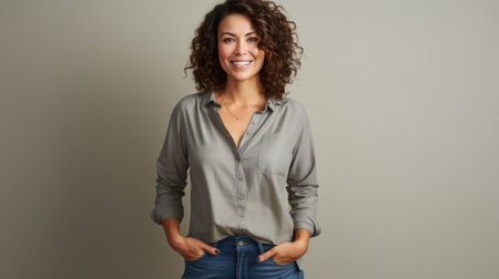 A young woman with a wide smile stands confidently against a clean white background. The scene focuses on simplicity and the joy of everyday moments.