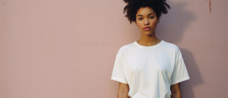 Young pretty African American woman model wearing tshirt looking at camera standing on color background. Face skin care cosmetics makeup, fashion ads. Beauty portrait. White t-shirt mock up template.