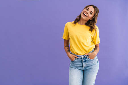Portrait of a beautiful excited young casual woman standing isolated over blue background