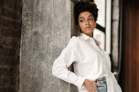 Young black woman leaning on wall and looking aside indoors